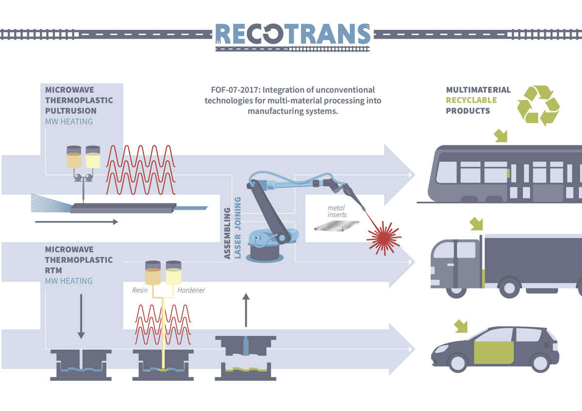 RECOTRANS project will integrate unconventional manufacturing technologies such as (microwave) MW radiation and laser joining in current RTM and pultrusion production lines to be able to obtain cost-effective recyclable multi-material composites suitable for the transport sector at high production rates; 2 m/min for pultrusion and 2 min/cycle for RTM (up to 50% reduction in polymerization time), reducing cost and energy consumption compared to current composites materials.